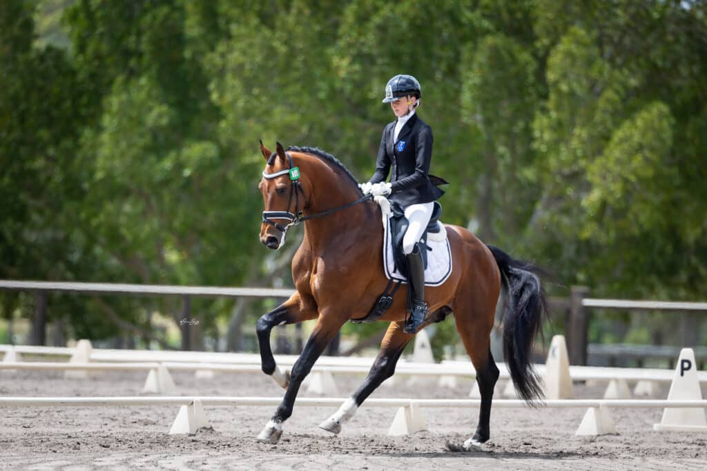 In second place, Jayden’s second ride, the big black mare D’Esperanza, impressed with a score of 69.420%. Her piaffe was more secure, and the canter work particularly strong and rhythmic. A marked improvement, yet the scores as yet reflect that. This elegant mare continues to improve in self-carriage, contact, and balance, showing all the hallmarks of a future championship horse.