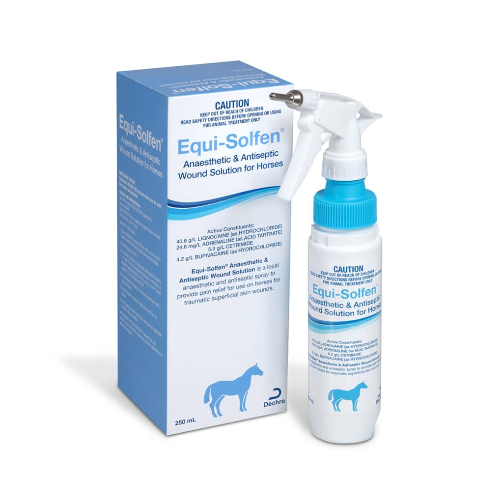 Equi-Solfen is a new anaesthetic and antiseptic spray that provides 4-in-1 pain relief and wound care for horses with superficial skin wounds.