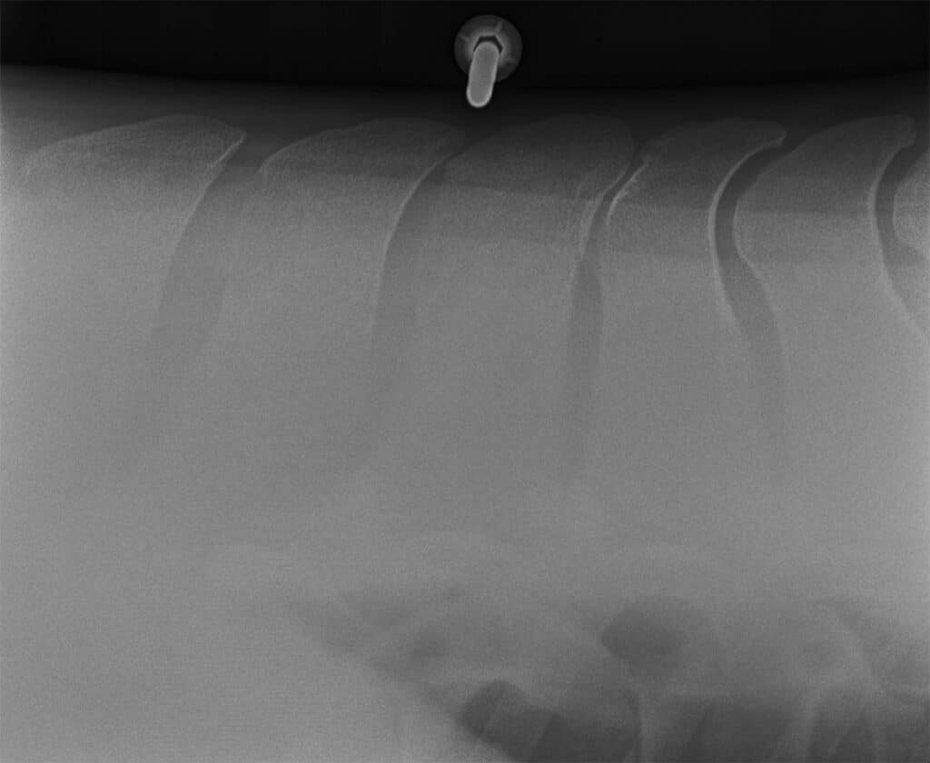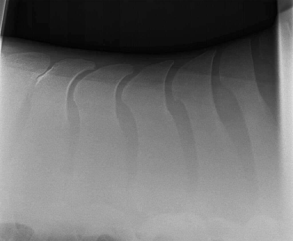 An X-ray showing both normal spacing of the spines, as well as kissing spines (left hand side) where the close dorsal spinous processes in between show some inflammation and degeneration occurring.