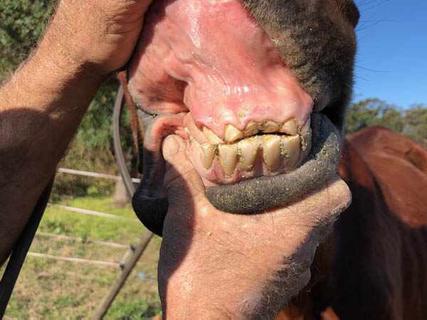 A – Rescue horse Gabriel had a body score of one and was sent straight to Dr Mather for a health check before coming to HHH. B – 18-year-old Gabriel’s teeth; the loss of top teeth is quite common in chronically starved horses on short to nil pasture.