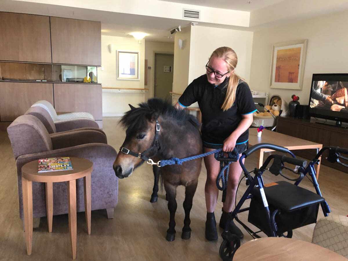 Sometimes the horses go “gadabout” – visiting residents of aged care homes (even travelling in lifts and squeezing in between beds) and schools.