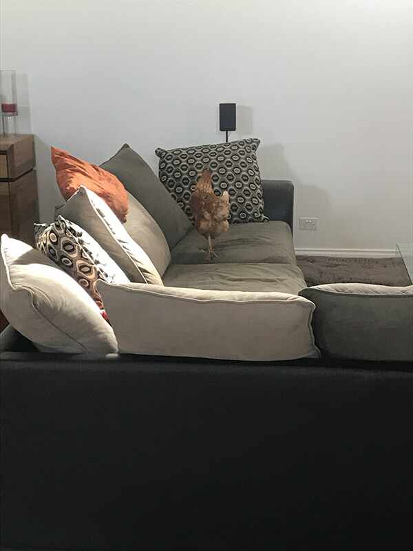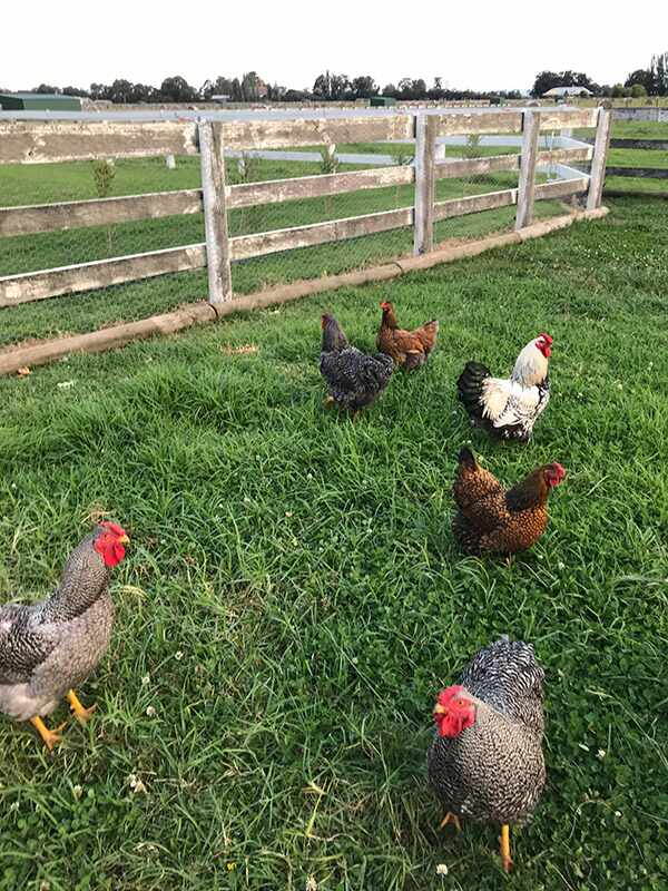 A – The chickens enjoy free range of the paddocks. B – And on occasion, the house.