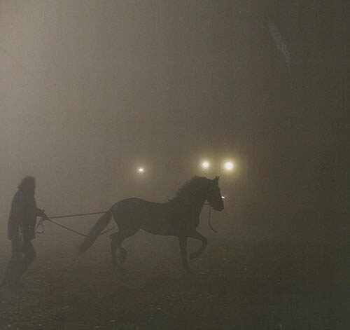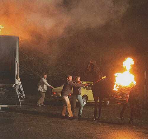 “He was amazing,” says Luraschi. “He remained perfectly still with the flames only a few inches from his head which was covered in a protective gel. He was so stoic despite the heat, the melting ceiling and the smoke. For the galloping scene on the highway, I directed him in long, transparent reins between the cars – he was so obedient.”