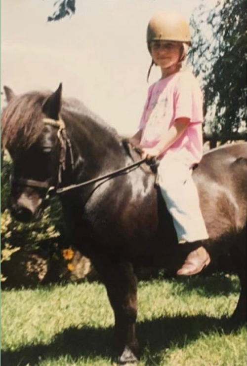 Simone Pearce a) riding in the eary days as a horse-mad kid, and b) competing at her first Oympics in Tokyo with Destano. © Hippo Foto – Dirk Caremans.