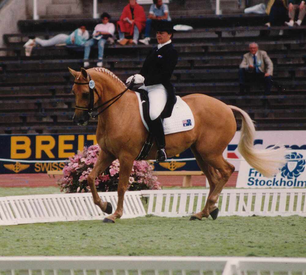 Over the summer of 1989-90, there were many selection events and Gill, who was now at Grand Prix, competed. The international judge at the Melbourne qualifier had Peaches in first place — and back then the international judge’s placing was the only one that counted, so it was a great start! This put them on the long list and suddenly the national judges were taking a lot more notice. At the final selection at Lochinvar, again the international judge placed them first which was enough to put them on the squad to go overseas and try for the team for the Stockholm World Equestrian Games! The squad was Gill and Peaches, Glennis Barrey and Livius, Peter Weston and Tutenkhamen, Rozzie Ryan and Stirling Wilton, and Anne Honner with Sydney Symphony. Peaches did a cracker of a test in Fontainebleau and they were subsequently selected with Glennis, Rozzie and Peter, with Anne the reserve.