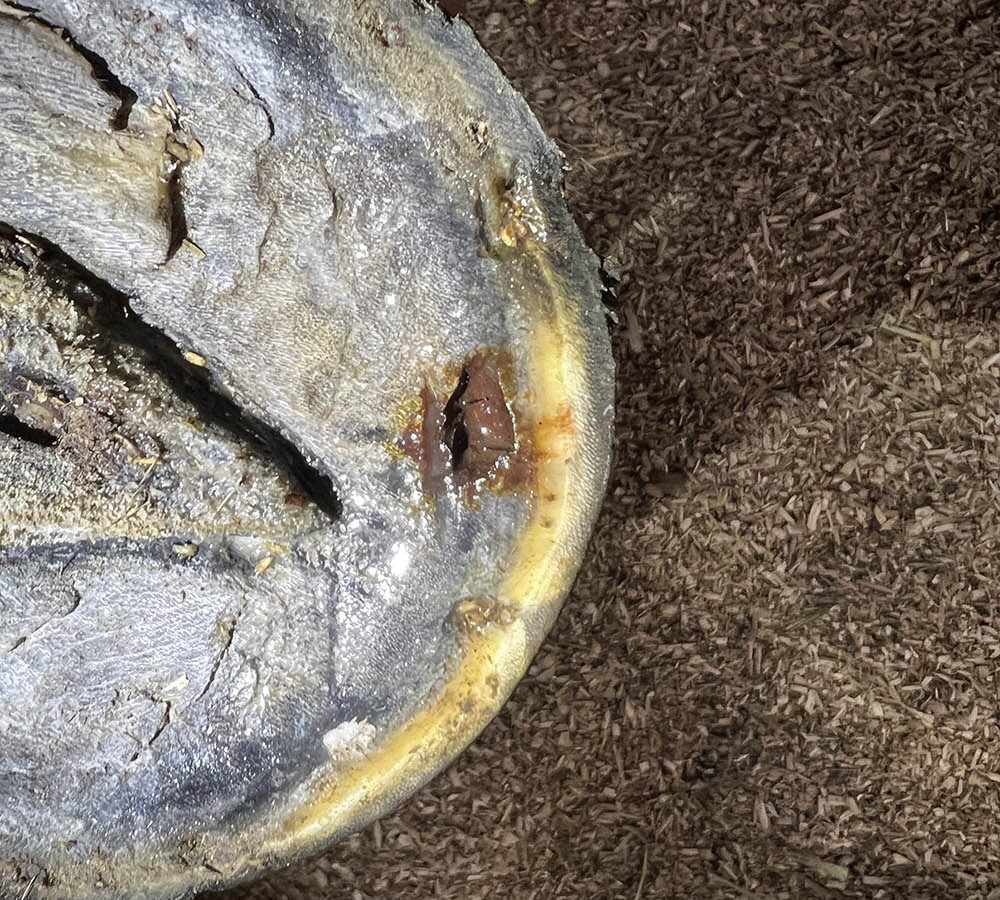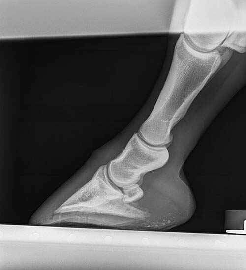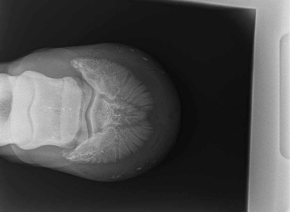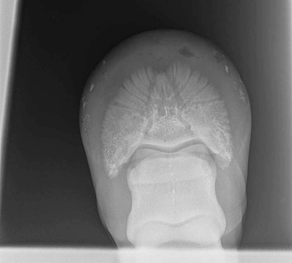 The lameness improved under the farrier’s care initially but returned about a week or so later. An abscess or an under-run sole due to an infection was suspected, but with pain around the whole foot, the farrier could not isolate an area on the sole to dig into and relieve the pressure. Despite daily bathing of the foot and hot poultices applied, the horse remained lame with no sign of an abscess tracking out of the foot.
