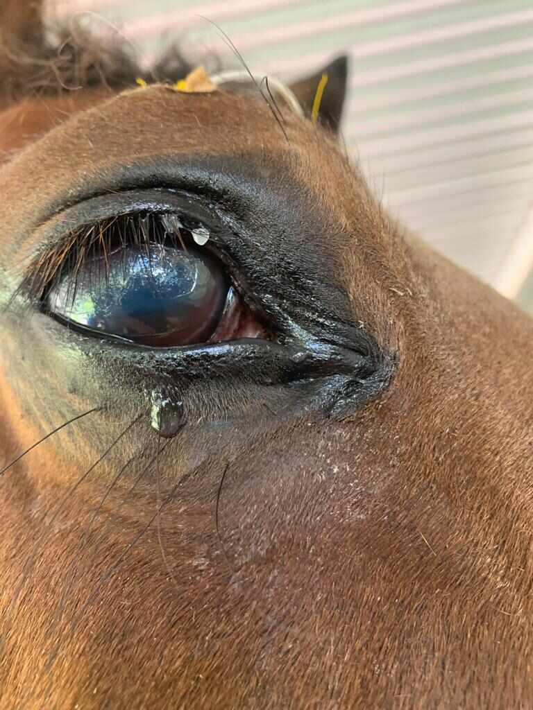A: Vivienne suffered a superficial eye ulcer that took a long time to heal. B: Eventually, Vivienne could get back to work with a little extra eye protection. Images supplied.
